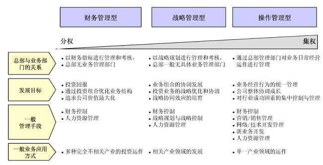 企業(yè)管控模式,是指企業(yè)對分子公司基于集分權程度不同而形成的管控策略,它是一套復雜的體系,包括確定公司的治理結構、劃分總部及分子公司的角色定位和職能、選擇公司的組織框架、確定企業(yè)的重要資源分配方式及建立流程和績效管理體系等,通過確定一系列規(guī)章制度和管理方法以約束和激勵分子公司朝著確定的戰(zhàn)略和目標努力,確保目標的有效和高效實現(xiàn)。